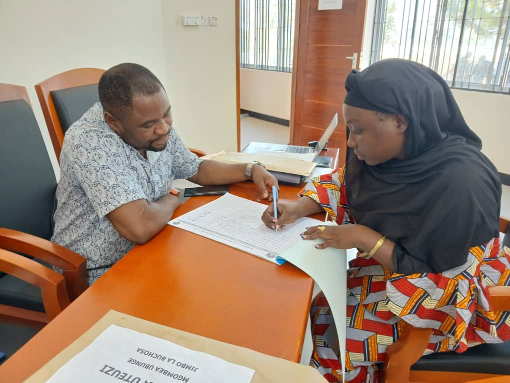 Mgombea kupitia Chama cha CHAUMMA Bi.Esther Fulano akijaza fomu za uteuzi leo mapema katika Ofisi za Msimamizi wa Uchaguzi jimbo la Buchosa.