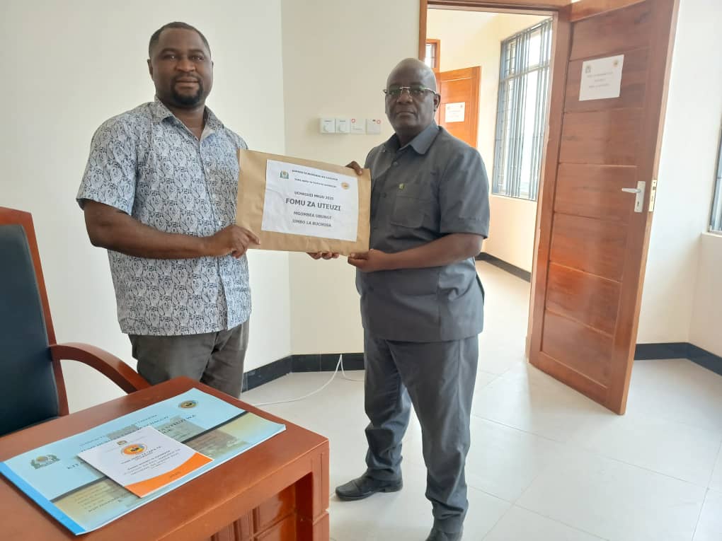Mgombea kupitia Chama cha ACT Wazalendo Bw.Faustine Ruhabuza (mkono wa kulia) akikabidhiwa fomu za uteuzi leo mapema katika Ofisi za Msimamizi wa Uchaguzi jimbo la Buchosa.